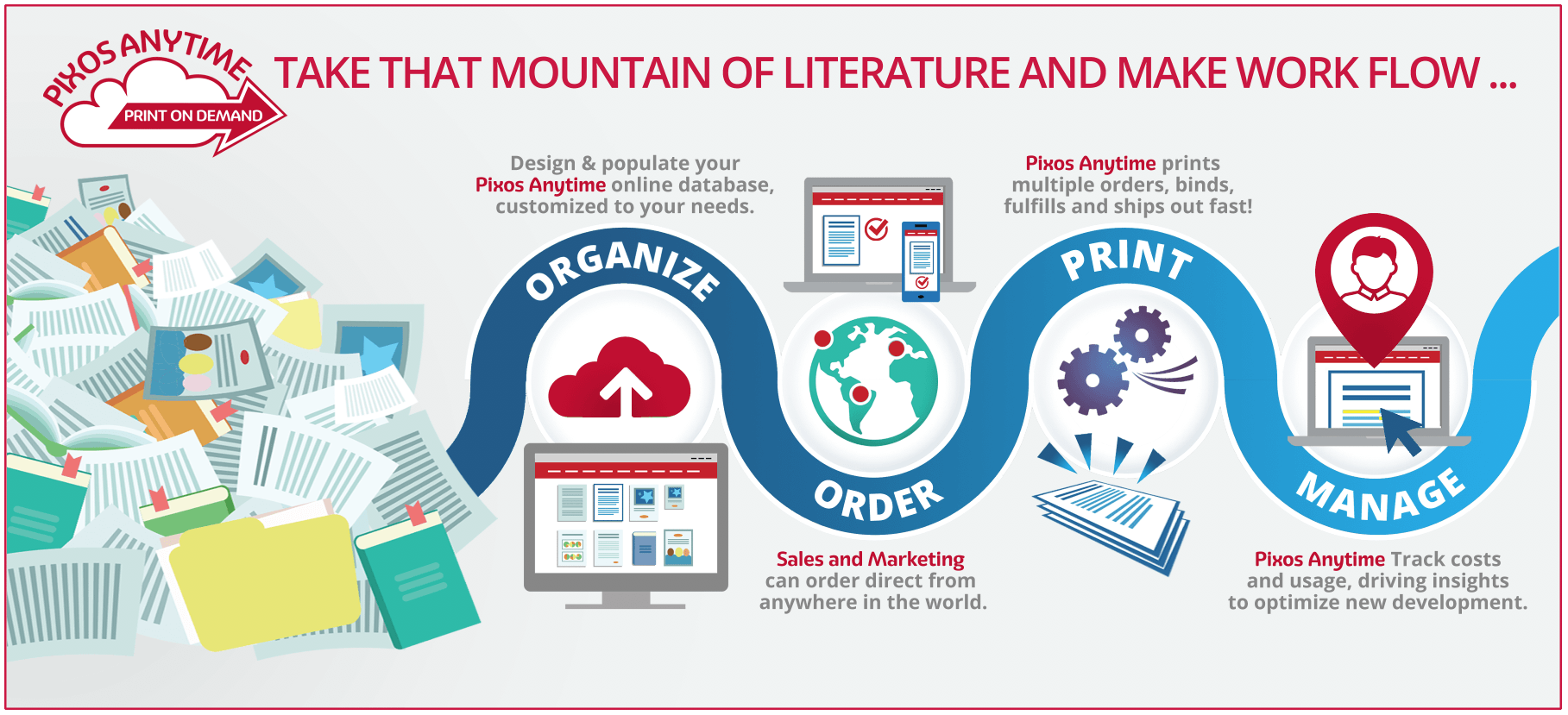 In B2B terms, think of us as "Quality Meets Digital." And with Pixos Anytime, we've optimized digital-on-demand to deliver the results our B2B clients require, from creating an easy, online ordering experience to on-time delivery of quality output anywhere in the world.